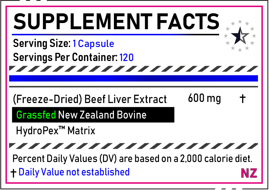 (Freeze-Dried) Beef Liver Extract (New Zealand Bovine) 600mg, Vegetarian Capsule, Rice Flour, Silicon Dioxide, Magnesium Stearate, Hydroxypropyl-β-Cyclodextrin, Piperine, Astragalus Membranaceus, Panax Ginseng