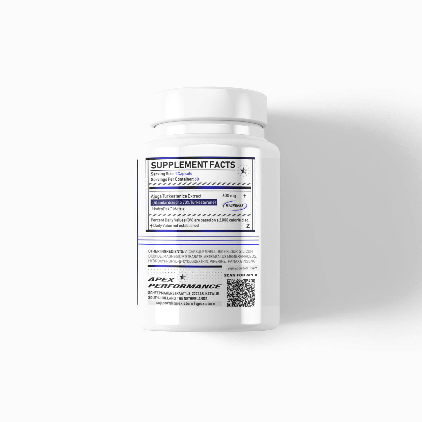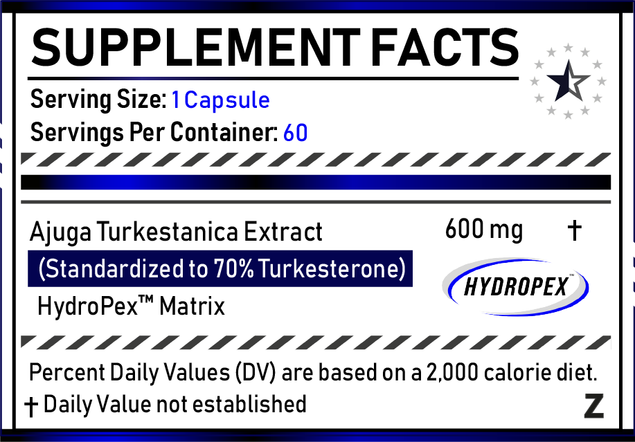Ajuga Turkestanica Extract (Ajuga Turkestanica) (Standardized to 70% Turkesterone) 600mg, Vegetarian Extract, Vegetarian Capsule, Rice Flour, Silicon Dioxide, Magnesium Stearate, Hydroxypropyl-Beta-Cyclodextrin, Piperine, Astragalus Membranaceus, Panax Ginseng